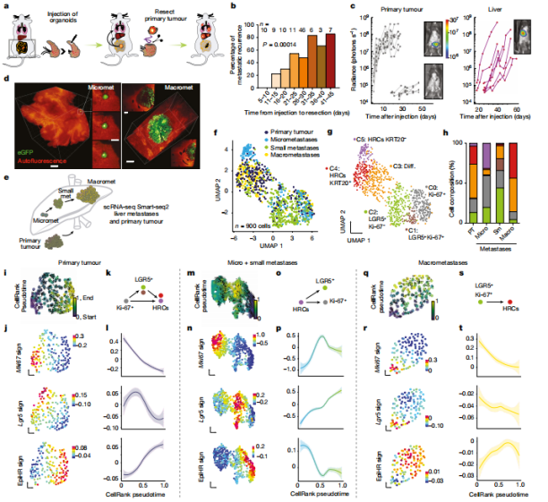 接著研究團隊建立了CRC小鼠模型,模擬手術切除原發(fā)腫瘤后發(fā)生轉移性復發(fā)的過程。發(fā)現(xiàn)原發(fā)性CRC手術后,小鼠肝臟中殘留的HRCs的增殖活動很少,對原發(fā)性結腸癌的生長沒有貢獻。但隨著時間的推移,殘留的HRCs會產(chǎn)生多種細胞類型,包括LGR5干細胞樣腫瘤細胞。這群HRC細胞能夠脫離原發(fā)性結腸癌,遷移到血液中,到達肝臟,并在手術后隱藏一段時間,隨后引發(fā)明顯的腫瘤轉移。