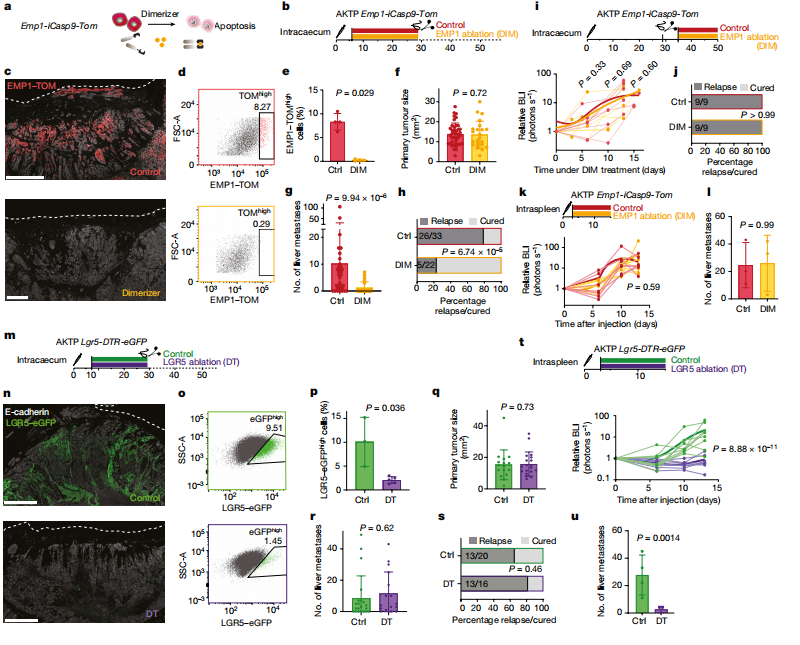 為了找到結直腸癌的轉移性復發(fā)的真正來源,研究人員借助人和小鼠模型,借助單細胞轉錄組測序技術(scRNA-seq),發(fā)現(xiàn)EMP1在 HRCs細胞中高表達,且與EpiHR基因的表達有很大的重疊。進一步通過細胞消融實驗,證明了導致腫瘤復發(fā)來源于殘留的EMP1陽性細胞。