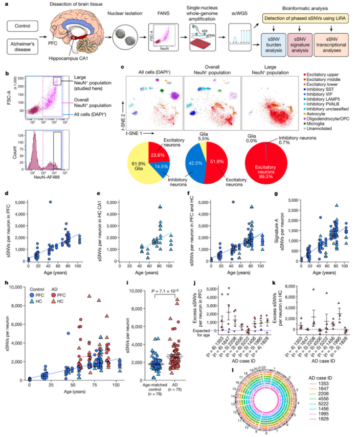 對(duì)從AD和神經(jīng)典型對(duì)照個(gè)體的大腦中分離出來(lái)的神經(jīng)元進(jìn)行了單細(xì)胞全基因組測(cè)序(scWGS),染色了泛神經(jīng)元標(biāo)記NeuN來(lái)標(biāo)記神經(jīng)元,并進(jìn)一步只標(biāo)記了大的NeuN陽(yáng)性核,使用多位移放大(MDA)進(jìn)行全基因組擴(kuò)增,分析了8例AD的91個(gè)神經(jīng)元和18個(gè)神經(jīng)典型對(duì)照組的159個(gè)神經(jīng)元。在神經(jīng)典型個(gè)體中,神經(jīng)元sSNVs隨著年齡的增長(zhǎng)而增加,sSNVs的年增長(zhǎng)率相當(dāng)高,從每年13到55個(gè)sSNV不等,在一些特殊細(xì)胞類型中,分裂突變率更高。沒(méi)有神經(jīng)診斷的個(gè)體的海馬CA1神經(jīng)元顯示,隨著年齡的增長(zhǎng),sSNVs呈積累的趨勢(shì),這與神經(jīng)典型對(duì)照個(gè)體前額葉皮層(PFC)神經(jīng)元中看到的sSNV的增加沒(méi)有顯著差異。