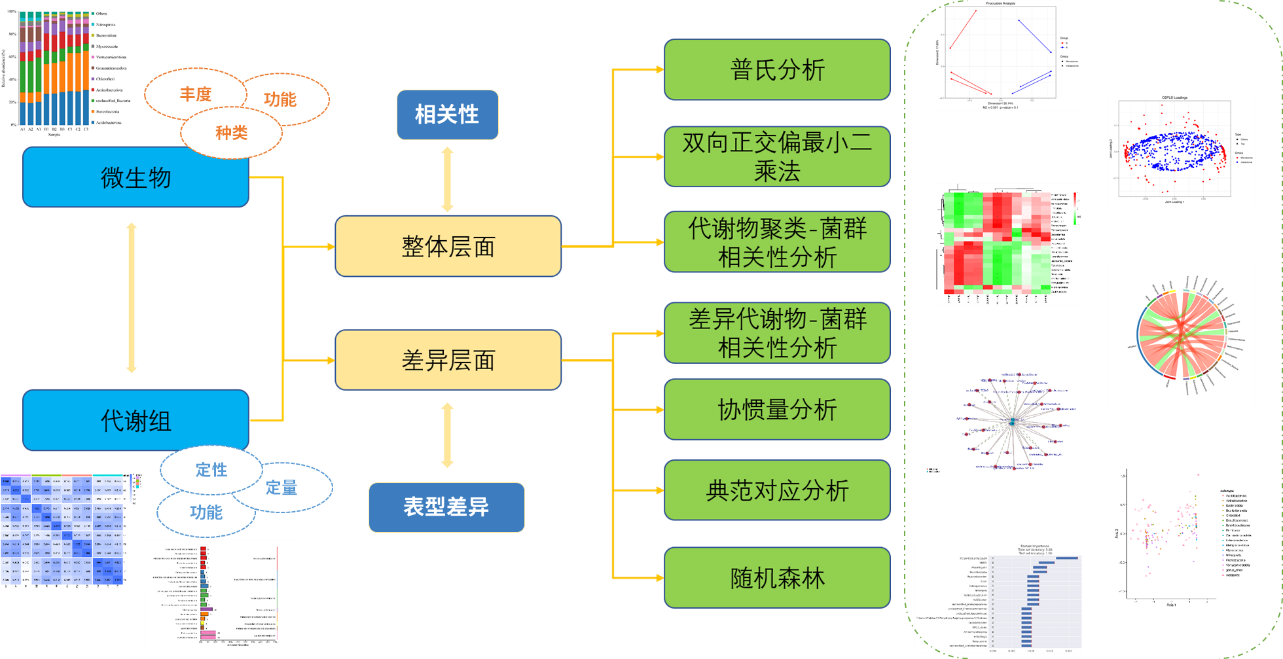 微生物和代謝組聯(lián)合分析從兩個(gè)層面去進(jìn)行聯(lián)合,整體層面去展示微生物和代謝物之間的整體相關(guān)性,比如普氏分析、代謝物聚類-菌群相關(guān)性分析;從差異層面則基于不同的差異處理組,去進(jìn)一步聯(lián)系表型關(guān)系,看具體的微生物和代謝之間的關(guān)系是否與生物的表型差異相關(guān),這里則主要有差異代謝物和菌群相關(guān)性分析、協(xié)慣量分析、典范對(duì)應(yīng)分析、隨機(jī)森林分析等,接下來我們就這些分析和大家具體看下怎么解讀和應(yīng)用。