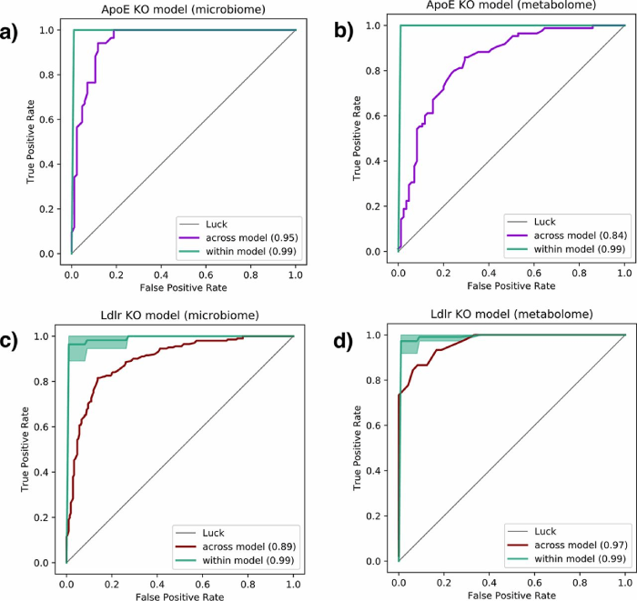 綠色曲線代表每個(gè)小鼠模型內(nèi)的分類準(zhǔn)確性。紫色ROC曲線對(duì)應(yīng)于使用來自ApoE-/-小鼠模型的腸道微生物組(a)和代謝組(b)數(shù)據(jù)訓(xùn)練的模型,以預(yù)測(cè)Ldlr-/-小鼠的IHH暴露。紅色曲線顯示的是在ApoE-/-小鼠上測(cè)試的Ldlr-/-小鼠的微生物組(c)和代謝組(d)數(shù)據(jù)。IHH:間歇性低氧和高碳酸血癥。