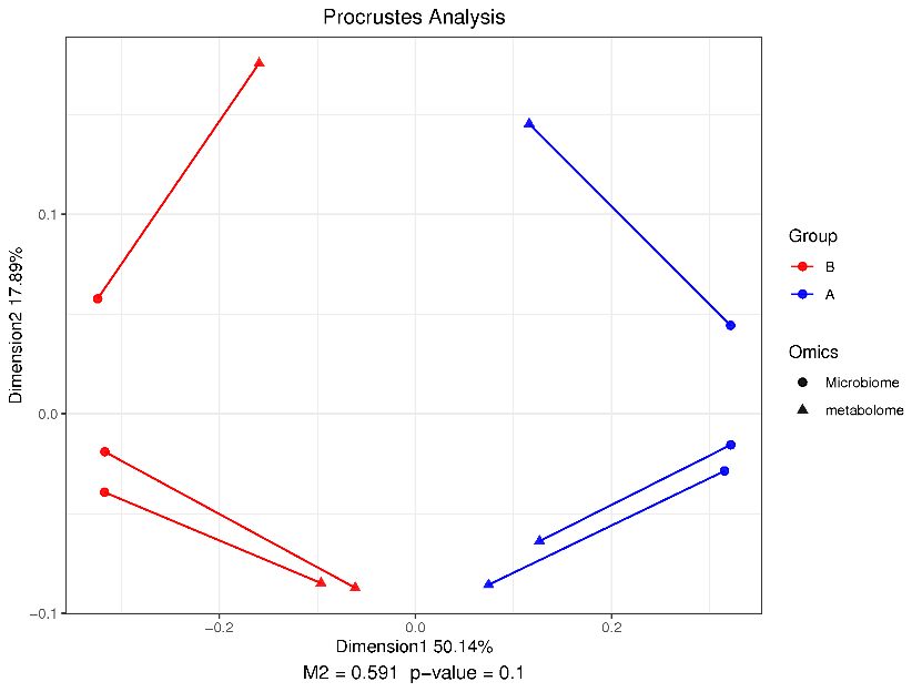 由于兩組數(shù)據(jù)集的屬性不同,并不適合用來直接比較,可分別對(duì)兩個(gè)數(shù)據(jù)集降維排序分析,并提取特征軸的坐標(biāo)。本分析選用 PCoA 分別對(duì)微生物組(屬水平)和代謝組進(jìn)行降維排序,之后進(jìn)行Procrustes分析,比較微生物組與代謝組之間的相似和變異情況。