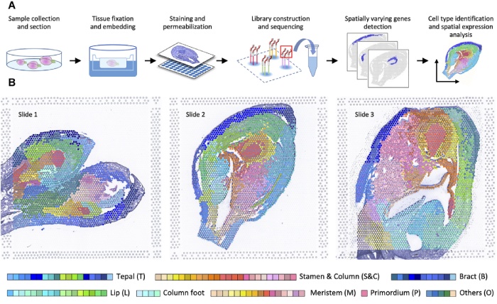 研究內(nèi)容:利用10x Visium空間轉(zhuǎn)錄組學(xué)數(shù)據(jù)分析了蝴蝶蘭花器官早期發(fā)育過程中基因表達(dá)的動(dòng)態(tài)變化。通過對時(shí)空表達(dá)分布的比較,確定了在特定組織/階段優(yōu)先表達(dá)的數(shù)千個(gè)基因,包括MADS-box基因和許多其他潛在下游基因,形成了花器官初始化、身份決定和形態(tài)建成的模型。對蘭花開花發(fā)育過程進(jìn)行了系統(tǒng)的研究,為進(jìn)一步研究蘭花開花過程中復(fù)雜而重要的基因調(diào)控網(wǎng)絡(luò)提供了寶貴的資源。