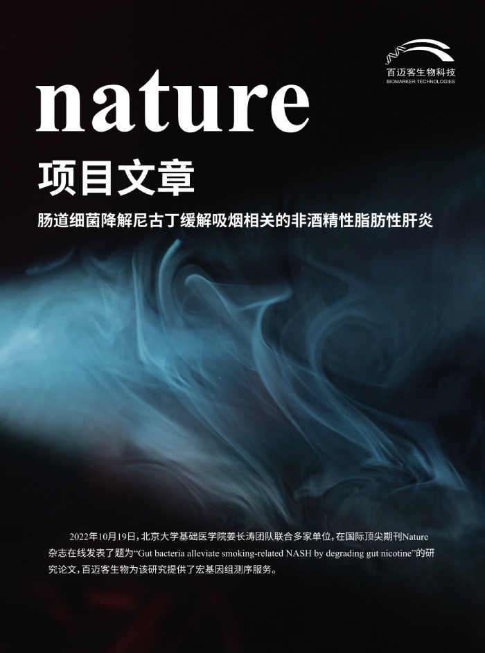 2022年10月19日,北京大學(xué)醫(yī)學(xué)部姜長濤團隊聯(lián)合美國國立衛(wèi)生研究院、浙江大學(xué)醫(yī)學(xué)院、復(fù)旦大學(xué)基礎(chǔ)醫(yī)學(xué)院和溫州醫(yī)科大學(xué)的研究團隊在國際期刊《Nature》發(fā)表了題為“Gut bacteria alleviate smoking-related NASH by degrading gut nicotine”的重磅研究。該研究解析了腸道尼古丁積累在非酒精性脂肪性肝炎進展中的作用,發(fā)現(xiàn)了人類腸道中一種能夠代謝尼古丁的內(nèi)源性細(xì)菌,并提出了一種可能的減少吸煙加劇NAFLD進展的途徑。百邁客為該研究提供了宏基因組測序服務(wù)。點擊了解詳情:Nature-宏基因組聯(lián)合多組學(xué)研究揭示腸道有益菌對非酒精性脂肪性肝炎的保護作用