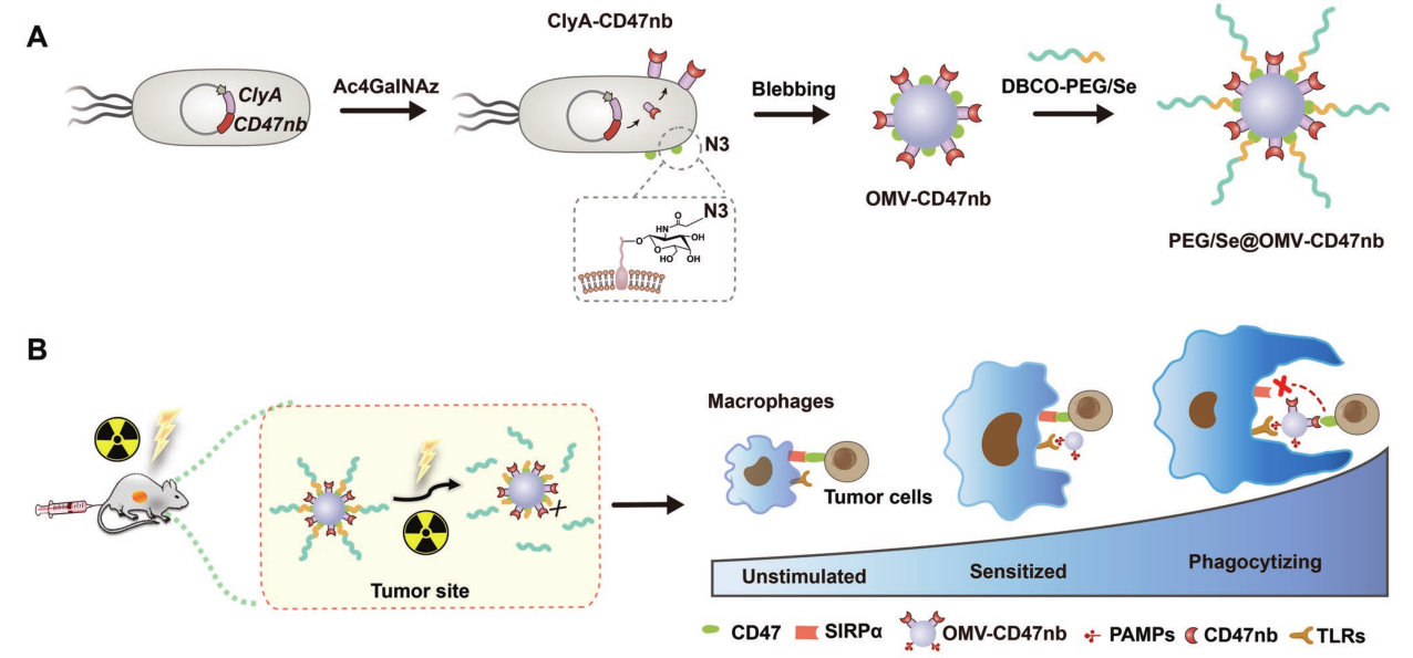 CD47納米抗體(CD47nb)融合到OMV表面(OMV-CD47nb),OMV-CD47nb可以同時(shí)與腫瘤細(xì)胞的CD47和TAMs的TLRs結(jié)合;外表面涂有含有二烯酰胺鍵(PEG/Se)的聚乙二醇(PEG)層,形成PEG/Se@OMV-CD47nb,PEG/Se層的修飾可以減輕了OMV-CD47nb的免疫原性,顯著提高給藥劑量;