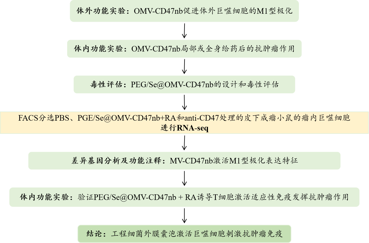 細(xì)菌衍生的外膜囊泡(OMV)是高免疫原性納米囊泡,已經(jīng)成為腫瘤免疫治療常用的傳遞載體;巨噬細(xì)胞作為腫瘤微環(huán)境(TME)中的抗原遞呈細(xì)胞,可以處理被吞噬的腫瘤細(xì)胞,并將腫瘤抗原呈遞給T細(xì)胞,從而激活抗原特異性免疫反應(yīng),腫瘤細(xì)胞表現(xiàn)出CD47“don’t eat me”信號(hào)的高表達(dá),阻礙了巨噬細(xì)胞的吞噬作用;腫瘤相關(guān)巨噬細(xì)胞(TAM)與免疫抑制性M2極化巨噬細(xì)胞非常相似,與腫瘤免疫逃逸和腫瘤進(jìn)展有關(guān),TAMs的jing q高效激活是一種非常有前景的腫瘤免疫治療方法。
