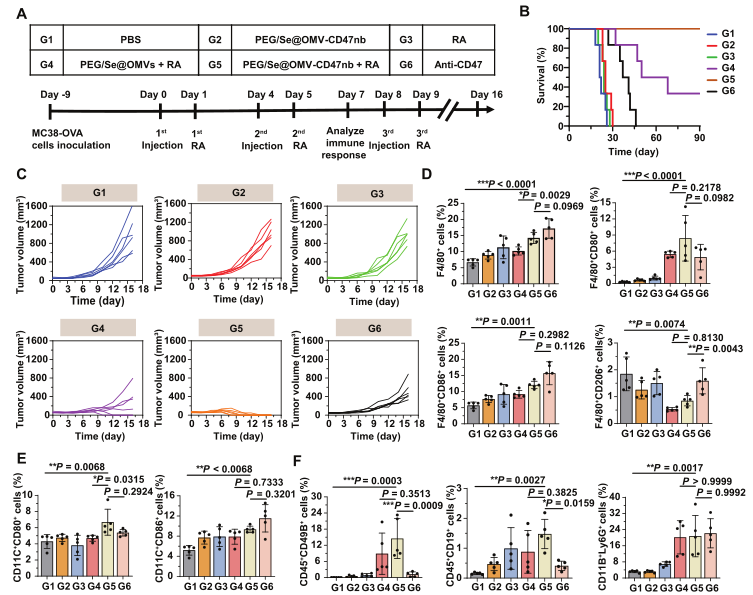 分別構(gòu)建PBS、PEG/Se@OMV-CD47nb、RA(局部放射治療)、PEG/Se@OMV+RA、PEG/Se@OMV-CD47nb+RA、anti-CD47處理的MC38-OVA皮下成瘤小鼠模型(表達(dá)卵清蛋白的MC38小鼠結(jié)腸癌細(xì)胞系),評(píng)估抗腫瘤效果(圖2A)。結(jié)果顯示,90天后,PEG/Se@OMV-CD47nb+RA組小鼠存活率100%,PEG/Se@OMV+RA組小鼠存活率33.3%,其余組小鼠均全部死亡(圖2B);單獨(dú)RA與PEG/Se@OMV-CD47nb處理沒有引起明顯的抗腫瘤活性,而RA與PEG/Se@OMV-CD47nb聯(lián)合顯示出顯著的抗腫瘤效果,但并且與臨床上使用的陽性對(duì)照anti-CD47相比,CD47nb的抗腫瘤作用更強(qiáng)(圖2C)。