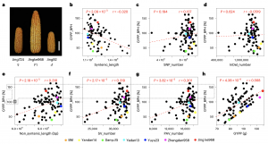 之前研究報道了雜種優(yōu)勢與分子遺傳距離(GD)存在弱正相關(guān)關(guān)系。本研究為了研究產(chǎn)量雜種優(yōu)勢與遺傳變異之間的關(guān)系,首先將基因組劃分為共線性和和非共線性區(qū)域。相關(guān)分析顯示,共線性區(qū)域長度與GYPP的BPH呈顯著負(fù)相關(guān)(圖5b)。共線性區(qū)域的SNPs和small InDels僅與GYPP的BPH呈弱相關(guān) (圖5c和5d)。相反,非共線性區(qū)域長度、SV_Number和PAV_Number均與GYPP的BPH呈顯著正相關(guān)(圖5e-g)。其中,SV_Number與GYPP雜種優(yōu)勢表現(xiàn)出強的相關(guān)性(圖5f)。SVs可以進(jìn)一步分為插入或缺失、串聯(lián)收縮擴(kuò)張和重復(fù)收縮擴(kuò)張。其中,插入缺失與GYPP雜種優(yōu)勢的相關(guān)性強。綜上所述,表明SVs的數(shù)量對GYPP的貢獻(xiàn)很顯著,支持了SVs在雜種優(yōu)勢中起主導(dǎo)作用這一觀點。