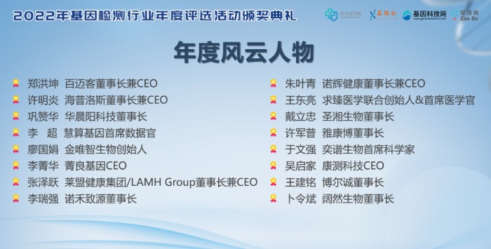 2023年1月10日,由基因檢測(cè)行業(yè)主流媒體聯(lián)合主辦的“第二屆基因檢測(cè)行業(yè)發(fā)展高峰論壇暨2022年基因檢測(cè)行業(yè)年度評(píng)選活動(dòng)頒獎(jiǎng)典禮”于廣州舉行。