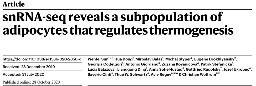 [4]snRNA-seq reveals a subpopulation of adipocytes that regulates thermogenesis.Wenfei Sun,Hua Dong,Miroslav Balaz, et al.Published online: 28 October 2020.