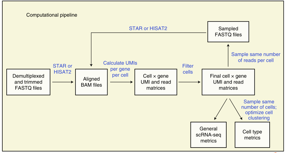 首先,開(kāi)發(fā)了“scumi”軟件包,從FASTQ文件到產(chǎn)生適用下游分析的基因和細(xì)胞參數(shù);其次,提出了下游分析前過(guò)濾低質(zhì)量細(xì)胞的方案,這也是數(shù)據(jù)預(yù)處理的重要挑戰(zhàn),然后對(duì)每個(gè)實(shí)驗(yàn)類型每個(gè)細(xì)胞進(jìn)行相同的reads數(shù)分析;最后,通過(guò)關(guān)鍵的參數(shù)對(duì)每種方法進(jìn)行評(píng)估:①比對(duì)到細(xì)胞核和線粒體基因組的reads 及其結(jié)構(gòu);②捕獲RNA的靈敏度;③多胞率;④準(zhǔn)確性和重復(fù)性;⑤得到細(xì)胞類型中重要的生物學(xué)差異的能力(圖2-1)。