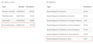 (1)數(shù)據(jù)相關(guān)統(tǒng)計(jì):新增有效reads數(shù)及占比、基因反義鏈比對(duì)率