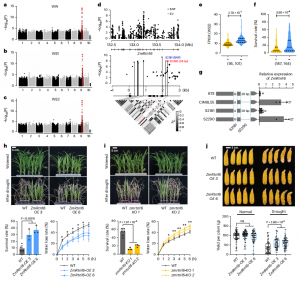 研究發(fā)現(xiàn),位于ZmABF4基因第二內(nèi)含子的SNP (S1474)和SV (S3205, 42 bp)與該基因的表達和苗期抗旱性密切相關。ZmABF4編碼bZIP轉錄因子,為ABA和干旱誘導表達的主要調節(jié)因子。攜帶ZmABF4CIMBL55等位基因的種質在基因表達和抗旱性方面明顯高于攜帶ZmABF4B73等位基因的種質(圖3d, e)。轉基因過表達分析發(fā)現(xiàn),與野生型(WT)相比,ZmABF4轉基因株系在干旱脅迫下存活率顯著提高,葉片失水率降低(圖3f-h)。說明ZmABF4對玉米抗旱性具有正向調控作用,?ZmABF4CIMBL55可能是玉米抗旱性的優(yōu)異等位基因。