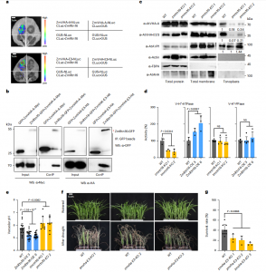 為了解ZmRtn16的生物學功能,亞細胞定位分析發(fā)現(xiàn)ER標志物與ZmRtn16-GFP融合蛋白共定位在ER中,表明ZmRtn16-GFP在ER中發(fā)揮作用。免疫共沉淀(co-IP)顯示ZmRtn16能與液泡膜H+-ATPase復合體A (ZmVHA-A)和E3亞基?(ZmVHA-E3)相互作用。隨后,通過比較zmrtn16-crispr和WT株系的ZmVHA-A和ZmVHA-E3亞細胞定位,發(fā)現(xiàn)ZmRtn16可以促進ZmVHA-A和ZmVHA-E3的液泡膜定位(圖6c)。此外,與WT植物相比,ZmRtn16-OE株系液泡質子泵活性較高,而ZmRtn16-KO株系液泡質子泵活性較低(圖6e),突出了液泡質子泵在抗旱性上的作用。綜上所述, CIMBL55基因組中ZmRtn16基因3′ -UTR中28 bp缺失,可能增強ZmRtn16的表達,促進了ZmVHA-A和ZmVHA-E3在液泡膜中的定位,從而提高玉米的抗旱性。