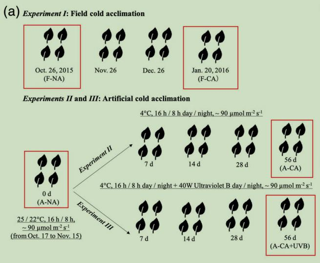 選3年生的“ElsieLee”杜鵑,用于田間或人工低溫馴化試驗(yàn),共3組試驗(yàn):ExperimentI田間低溫馴化(F-CA),ExperimentII人工低溫馴化(A-CA),ExperimentIII人工用紫外光B進(jìn)行低溫馴化(A-CA+UVB)。每組試驗(yàn)36盆,分為3個(gè)生物學(xué)重復(fù),每個(gè)生物學(xué)重復(fù)12盆,采集當(dāng)年生長的完全展開的葉子進(jìn)行實(shí)驗(yàn),葉片在抽樣日期收集后立即在液氮中冷凍,然后-80℃保存。