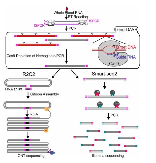 評估全血和組織的轉(zhuǎn)錄組研究常因高度豐富的轉(zhuǎn)錄本的過度表達而混淆。這些豐富的轉(zhuǎn)錄本是有問題的,因為它們與稀有RNA轉(zhuǎn)錄物競爭并阻止其檢測,從而模糊了它們的生物學(xué)重要性。當使用長讀長進行轉(zhuǎn)錄組分析時,這個問題更加突出,因為與短讀長測序相比,它們的數(shù)據(jù)產(chǎn)出相對較低。因此,基于長讀長的轉(zhuǎn)錄組分析對于非模式生物來說性價比極地。雖然有現(xiàn)成的試劑盒可用于選定的模式生物,它們能夠消耗大量的(HBA)和(HBB)血紅蛋白轉(zhuǎn)錄本,但不適用于非模式生物。為了解決這個問題,本研究采用了crispr/cas9基因耗盡法(通過雜交消耗大量序列)來進行長序列的全長cDNA測序,本研究稱之為Long-DASH。使用具有適當引導(dǎo)RNA的重組Cas9蛋白,在進行短期和長期測序文庫準備之前,可以在體外耗盡全長的血紅蛋白轉(zhuǎn)錄本?;诖耸褂帽狙芯康呐=蚣{米孔技術(shù)(ONT)為基礎(chǔ)的R2C2長讀長測序和基于Illumina短讀長的Smart-seq2方法并行測序耗盡的全長cDNA。為了展示這一點,本研究應(yīng)用本研究的方法從三只北極熊(Ursusmaritimus)的全血樣本中創(chuàng)建了一個同型水平的轉(zhuǎn)錄組。使用Long-DASH,本研究成功地消耗了血紅蛋白轉(zhuǎn)錄體,并產(chǎn)生了深度的Smart-seq2Illumina數(shù)據(jù)集和380萬個R2C2全長cDNAReads。應(yīng)用Long-DASH和本研究的異構(gòu)體識別系統(tǒng),本研究發(fā)現(xiàn)有大約6,000個高可信度的異構(gòu)體和一些新的基因。這表明北海熊的基因亞型具有較高的多樣性,目前尚未見報道。這種重復(fù)性和直接的方法不僅改進了北極熊的轉(zhuǎn)錄組注釋,而且將作為未來研究北極圈19個北極熊亞種群內(nèi)轉(zhuǎn)錄動力學(xué)的基礎(chǔ)。