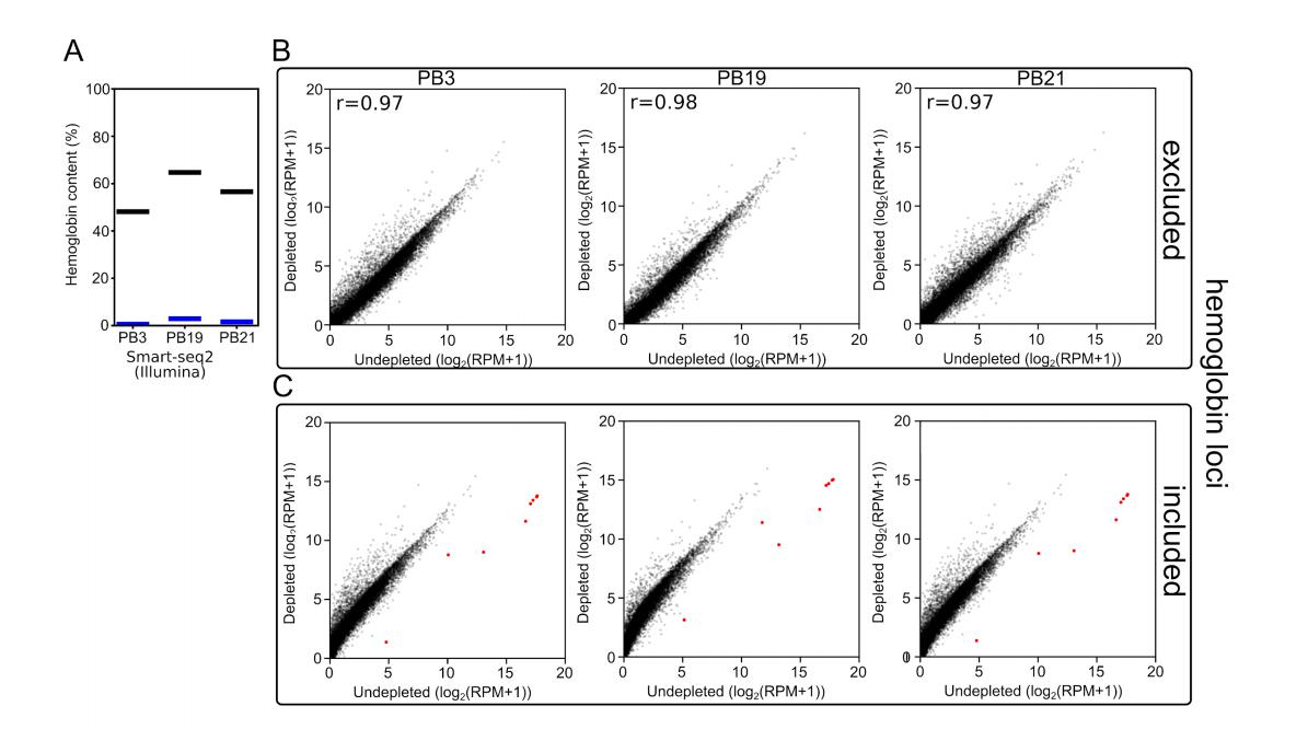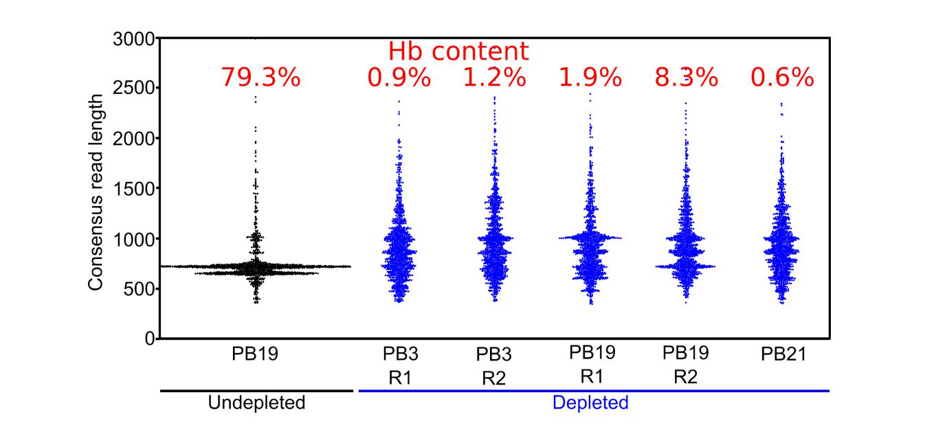 首先,本研究使用基于kmer的方法分析測序結(jié)果數(shù)據(jù),以估計來自血紅蛋白轉(zhuǎn)錄本的讀數(shù)。在未耗盡的cDNA池中,48-68%的reads被評分為起源于血紅蛋白轉(zhuǎn)錄本。在耗盡的樣品中,這種讀數(shù)減少到1-4%(圖3A)。