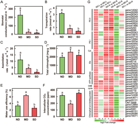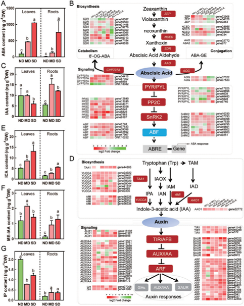 樣品做了三組處理:干旱處理0天(ND stress)、5天(MD stress)和10天(SD stress),并對光合作用進行了檢測,同時檢測了脫落酸(ABA)和生長素(auxin)的含量。