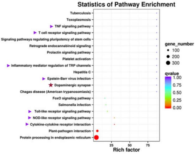在CyHV-3感染后第0天和第7天提取鯉魚頭腎組織,并通過Illumina和PacBio測序分析轉(zhuǎn)錄組。在對涉及的GOterm和KEGG途徑進行分析。加權基因共表達網(wǎng)絡分析用于揭示lncRNA對免疫基因的調(diào)節(jié)。結(jié)果表明,繁殖鯉魚品系通過一種特定的先天免疫機制對CyHV-3感染產(chǎn)生了顯著的抗性,主要的生物學過程是自噬、吞噬、細胞毒性和凝集素和MUC3阻斷病毒。此外,還有免疫抑制信號途徑,如IL21R對STAT3的抑制,PI3K介導的感染時多巴胺對炎癥的抑制,以及NLRC3在穩(wěn)定狀態(tài)下對STING的抑制。從非抗性品系中還發(fā)現(xiàn)了CyHV-3的可能易感因素,如ITGB1、TLR18和CCL4。本研究結(jié)果還表明,LncRNA調(diào)節(jié)的Nramp和PAI分別促進病毒感染和感染細胞的增殖,而T細胞白血病同源框3(TLX3),以及l(fā)ncRNA的半乳糖凝集素3可能在抗病制中發(fā)揮作用。因此,免疫遺傳不敏感或易受CyHV-3感染的免疫因子已被揭示。