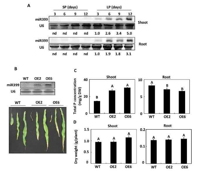 為了進一步調(diào)查ZmMIR399的功能,我們構(gòu)建了ZmMIR399b過表達的轉(zhuǎn)化玉米植株,利用農(nóng)桿菌作為中介將ZmMIR399b的前提序列導(dǎo)入玉米自交系ZZCO1未成熟的胚胎中,根據(jù)ZmMIR399b的表達情況,選出了兩個獨立的轉(zhuǎn)化時間,圖1B。在水培條件下評估ZmMIR399b過表達轉(zhuǎn)化玉米對低Pi的應(yīng)答。由于ZmPHTs是ZmMIR399的潛在靶標(biāo),且PHT與PHO2不是同系物,所以在擬南芥和水稻中的miR399過表達植株中出現(xiàn)的P中毒表型不會出現(xiàn)在玉米的轉(zhuǎn)化株中,但是在Pi缺乏條件下,ZmMIR399b過表達的玉米植株出現(xiàn)了典型的P中毒表型,在老葉的頂端和邊緣有萎黃或壞死,見1B。在Pi缺乏條件下,ZmMIR399b過表達的玉米老葉的P濃度是野生型的2倍,見圖1C。而在根中,野生型的總P濃度比轉(zhuǎn)化玉米的濃度高16-25%,見圖1C。相比之下,在P缺乏條件下野生型和轉(zhuǎn)化株根和地上部分的干重是相似的。