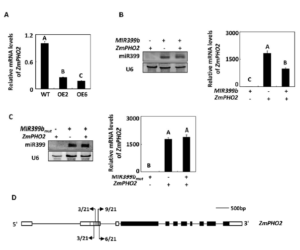 圖2:ZmPHO2被miR399轉(zhuǎn)錄后調(diào)控。A,qPCR檢測過表達轉(zhuǎn)化株的ZmPHO2轉(zhuǎn)錄本的表達;B、C,通過northernblot檢測MIR399b/MIR399bmut和ZmPHO2在煙草中的表達;D,通過5,RACE檢測ZmPHO2的切割位點