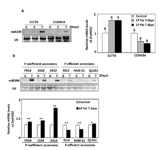 圖3:在磷高效和磷低效玉米株系中miR399的表達分析。A,在玉米自交系31778和CCM454中miR399和ZmPHO2轉(zhuǎn)錄本的表達;B,在其他玉米株系中miR399和ZmPHO2轉(zhuǎn)錄本的表達