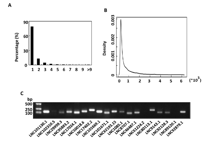圖4:玉米lncRNAs的鑒定。A,每個lncRNA轉(zhuǎn)錄本的外顯子分布;B,lncRNA的外顯子長度密度分布;C,RT-PCR證實隨機選擇的lncRNA