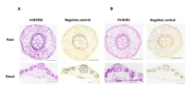 為了進一步揭示ZmmiR399b和PILNCR1之間可能的關(guān)系,我們通過原位雜交驗證ZmmiR399b和PILNCR1的表達模式。由于在磷充足條件下,ZmmiR399b和PILNCR1在玉米中的豐度比較低,于是去在pi缺乏條件下的第7天的玉米根和地上部分來驗證ZmmiR399b和PILNCR1表達模式。ZmmiR399b和PILNCR1在玉米的根和地上部分均能被檢測到,尤其是在維管束里,見圖6A-B。這些結(jié)果顯示ZmmiR399b和PILNCR1的空間定位至少有部分是重合的。