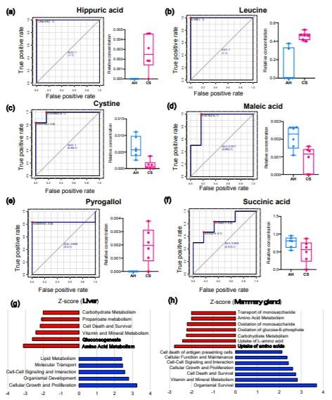 MG中的馬來酸(AUC=0.972,log2FC=-2.88;圖3d),鄰苯三酚(AUC=0.833,log2FC=6.26;圖3e)和琥珀酸(AUC=0.833,log2FC=-3.01;圖3f)是分離AH和CS動物的潛在生物標記。通過IPA識別,CS喂養(yǎng)的奶牛的肝臟中關鍵顯著下調(diào)的途徑是氨基酸(AA)代謝(P=1.66E-07,Z評分=-3.12),糖異生(P=3.86E-08,Z評分=-2.61))以及肝臟中的維生素和礦物質(zhì)代謝(P=1.47E-15,Z分數(shù)=-2.42)(圖3g);MG中AAs的攝?。≒=1.49E-08,Z分數(shù)=-2.77),攝取L-AA(P=4.52E-07,Z分數(shù)=-2.41),碳水化合物代謝(P=2.10E-11,Z分數(shù)=-2.24)和葡萄糖-6-磷酸的氧化(P=1.01E)-11,Zscore=-2.21)途徑顯著下調(diào)。(圖3h)