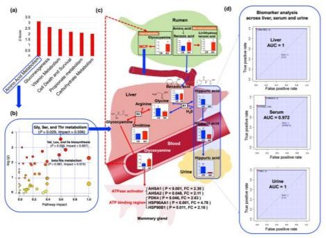 在兩個動物組之間,AA代謝途徑是肝臟中最顯著不同的途徑(圖5a)。對AA代謝途徑的進一步影響分析表明,亞途徑,甘氨酸,絲氨酸和蘇氨酸代謝的影響較大(圖5b,P=0.029,影響值=0.597)。因此,我們對肝臟中與甘氨酸相關的反應進行了徹底的分析,并研究了它們與體內(nèi)體液中代謝物的關系。綜合比較表明,苯甲酸,糖胺(GAA)和HCA在整個人體的AA代謝中起著關鍵作用,當母牛飼喂CS時,隨后會影響牛奶的合成(圖5c)。用CS喂養(yǎng)的奶牛肝臟中甘氨酸和HCA的濃度更高,進一步支持了我們的推測,即瘤胃(微生物)和肝臟(宿主)中的苯甲酸代謝都可能受到影響(圖5c)。對肝,血清和尿液進行的HCA生物標志物分析顯示出一致的結果(圖5d),這進一步表明,從肝臟到尿液的HCA循環(huán)是CS下牛奶產(chǎn)量變化的生物標志物。