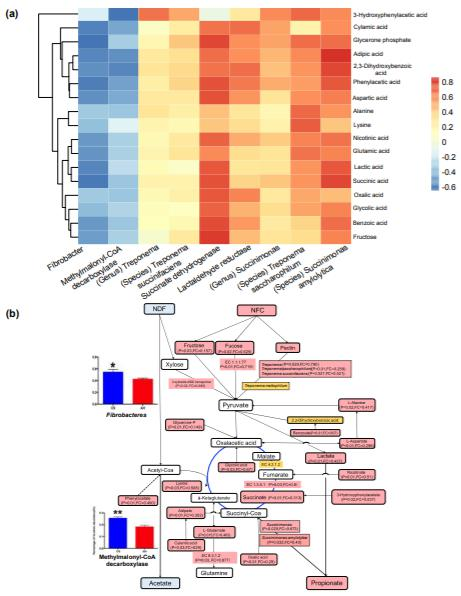 瘤胃液中55種明顯不同的代謝產(chǎn)物中,CS喂養(yǎng)的動物中49種的代謝產(chǎn)物含量較低,通過將微生物分類群相對豐度,碳水化合物代謝中的基因豐度和17種高度豐富的微生物代謝物相關聯(lián),研究了微生物代謝物與微生物之間的關系。核心宏基因組相關元素包括三個細菌屬(纖維桿菌,琥珀酸桿菌和螺旋體)),三種細菌種類(解淀粉琥珀酸桿菌,琥珀酸梅毒螺旋體和嗜糖鏈球菌)和三種微生物功能(甲基丙二酰輔酶A脫羧酶,琥珀酸脫氫酶和乳醛還原酶)(圖2a)。琥珀酸脫氫酶基因和解淀粉鏈球菌的相對豐度分別與16種代謝物(r介于0.43至0.68,P<0.1)和15種代謝物(r介于0.43至0.76,P<0.1)呈正相關。對上述瘤胃代謝組和代謝組的綜合分析顯示,當給動物喂食CS時,瘤胃中產(chǎn)生較低的丙酸根和較高的乙酸鹽的潛在機理(圖2b)。
