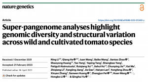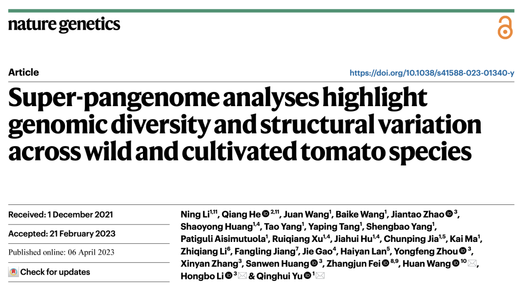 2023年4月6日,Nature Genetics《自然·遺傳學(xué)》發(fā)表了由新疆農(nóng)業(yè)科學(xué)院園藝作物研究所牽頭,中國農(nóng)業(yè)科學(xué)院深圳農(nóng)業(yè)基因組研究所、作物科學(xué)研究所、生物技術(shù)研究所等團(tuán)隊(duì)合作完成的題為Super-pangenome analyses highlight genomic diversity and structural variation across wild and cultivated tomato species的研究論文。該研究繪制了11個野生和栽培番茄的染色體級別高質(zhì)量基因組圖譜,闡明了茄屬番茄組(Solanum?section?Lycopersion)的基因組演化歷史,構(gòu)建了番茄超級泛基因組/圖基因組,并進(jìn)一步在野生番茄中克隆到可大幅提升栽培番茄產(chǎn)量的新基因一個。該研究既是對番茄基因組資源的重要補(bǔ)充,同時也對其它作物基因組學(xué)研究和野生種質(zhì)資源尤其是近緣野生種的利用具有重要啟發(fā)意義。該成果也是新疆農(nóng)業(yè)科學(xué)院首次以第一單位在Nature Genetics上發(fā)表長篇研究論文。?百邁客為本研究提供了相關(guān)測序及分析服務(wù)。