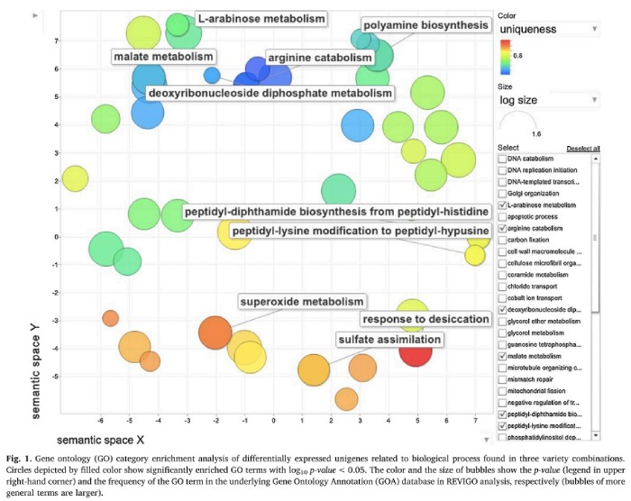 對(duì)差異表達(dá)的基因進(jìn)行 GO 富集分析。在生物過(guò)程類(lèi)別中,主要與超氧化物酶代謝,精氨酸分解代謝,蘋(píng)果酸代謝和多胺生物合成有關(guān)。分子功能類(lèi)別中的富集類(lèi)別為硫氧還蛋白活性,固醇結(jié)合,L-蘇氨酸氨裂解酶活性和富馬酰乙酰乙酸酶活性。在細(xì)胞成分類(lèi)別中,主要為高爾基體堆積,小亞基加工體,細(xì)胞外間隙和 1,3-β-D-葡聚糖合酶復(fù)合體。