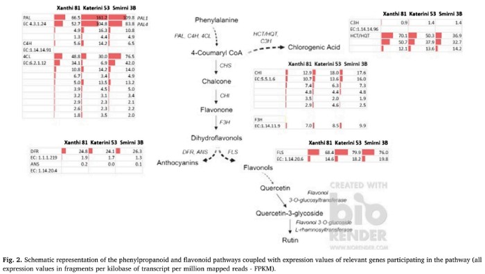 查爾酮合酶(CHS)是類(lèi)黃酮生物合成中的關(guān)鍵酶。研究者發(fā)現(xiàn)兩個(gè) CHS基因在三個(gè)煙草品種的葉片中均低表達(dá),因?yàn)?CHS 主要在花中組成性表達(dá),但其表達(dá)主要是由非生物/生物脅迫誘導(dǎo)的。注釋為 CHS-1B 或 CHS2 的Nitab4.5_0002920g0060.1 在’Katerini 53’和’Xanthi 81’中略有上調(diào),但第二個(gè)注釋為 III 型聚酮化合物合酶(NCBI:XP_016446648.1)差異很小。所有 CHI 基因也僅以低水平表達(dá),在鑒定的結(jié)果中 F3H 也沒(méi)有差異。另一方面,鑒定了兩個(gè)參與黃酮醇形成的 FLS 基因。FLS1(Nitab4.5_0005357g0020.1)(NCBI:LOC107794305)的表達(dá)最高,而 NtFLS(Ni-tab4.5_0006276g0010.1)的表達(dá)低得多。這兩個(gè)基因在品種之間沒(méi)有差異表達(dá)。還檢測(cè)到有助于花色苷生物合成的基因,例如 DFR 和 ANS。DFR 中第一個(gè)僅適度表達(dá),另外一個(gè)沒(méi)有差異。ANS(Nitab4.5_0003274g0110.1)幾乎未表達(dá)(圖 2)。蘆丁是一種黃酮醇糖苷,在花青素途徑生物合成,其中包括黃酮醇 3-O-葡萄糖基轉(zhuǎn)移酶和黃酮醇 3-O-葡萄糖苷胰島素轉(zhuǎn)移酶。結(jié)果表明低表達(dá)的 4 種黃酮醇 3-O-糖基轉(zhuǎn)移酶和 2種黃酮醇 3-O-糖苷胰島素轉(zhuǎn)移酶在“Smirrni 3B”和“Xanthi 81”比“Katerini 53”中表達(dá)更高、更多。