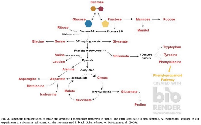 采集“Katerini 53”,“Xanthi 81”和“Smirrni 3B”葉片樣品,并使用氣相色譜GC-MS 和 LC-MS / MS 方法進(jìn)行代謝分析?;蛐皖A(yù)先鑒定為不同的色譜模式,共有 78 種代謝化合物(包括糖,氨基酸,有機(jī)酸)差異積累,如圖 3 所示。詳細(xì)的非靶向 GC-MS 代謝組學(xué)分析用于鑒定煙葉中產(chǎn)生的大多數(shù)主要代謝產(chǎn)物。在本研究中,所測(cè)得的最豐富的可溶性糖是果糖,葡萄糖,半乳糖和蔗糖。在果糖和蔗糖中檢測(cè)到統(tǒng)計(jì)學(xué)差異;“Katerini 53”中的果糖含量更高,而“Smierni 3B”中的蔗糖含量更高?!癒aterini 53”與其它兩個(gè)品種相比葡萄糖和半乳糖水平較高,差異無(wú)統(tǒng)計(jì)學(xué)意義。在可溶性醇中,兩個(gè)豐富的代謝產(chǎn)物是山梨糖醇和肌醇,但在品種之間未檢測(cè)到統(tǒng)計(jì)學(xué)上的顯著差異。這三個(gè)品種中的蘋(píng)果酸含量沒(méi)有任何統(tǒng)計(jì)上顯著不同?!癤anthi 81”葉子的氨基酸含量最高,但谷氨酸和 γ-氨基丁酸(GABA)除外。GABA 和脯氨酸是煙葉中的主要氨基酸。與其他兩個(gè)品種相比,“Smirrni 3B”中的 GABA 水平明顯更高。’Smirrni 3B’和’Xanthi 81’中的脯氨酸水平較高,而“Katerini 53”的脯氨酸水平最低。在“Smirrni 3B”中檢測(cè)到了高濃度的甘氨酸和絲氨酸這兩種必需氨基酸。煙草生物堿在根部合成,然后轉(zhuǎn)運(yùn)到葉片。生物堿、尼古丁與植物抗草食動(dòng)物防御有關(guān)。在三個(gè)品種中檢測(cè)到的尼古丁濃度在統(tǒng)計(jì)學(xué)上有顯著差異。結(jié)果表明,“Xanthi 81”的尼古丁濃度最高,而“Smirrni 3B”的尼古丁濃度最低。與“Katerini 53”相比,“Xanthi 81”中腐胺的含量有所降低,但其濃度仍高于“Smirrni 3B”。鑒定了所有擬參與煙草中尼古丁生物合成的相應(yīng)基因,但僅發(fā)現(xiàn)少數(shù)幾個(gè)在成熟葉片中表達(dá)。然而,基因 XS 和 QPT(三分之二)在“Xanthi 81”中表達(dá)較高。與其它兩個(gè)品種相比,這與“Xanthi 81”葉片中較高的尼古丁含量相關(guān),這表明它可能是遺傳控制的。