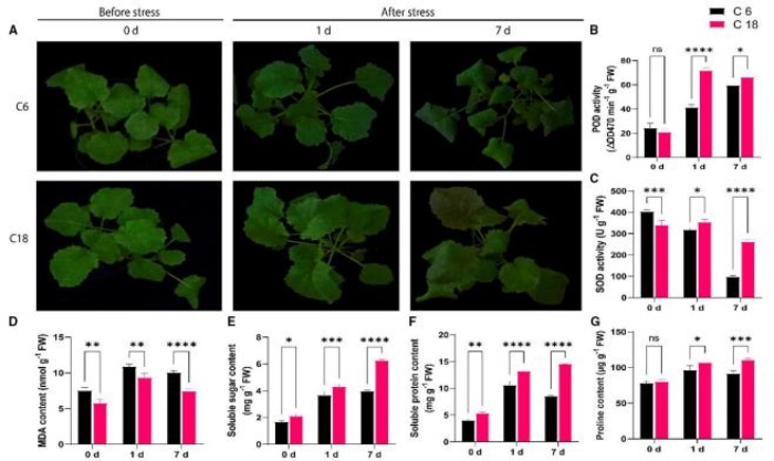 表型結(jié)果表明,C6 在冷處理 7 天時(shí)表現(xiàn)出比 C18 嚴(yán)重的萎蔫和褪綠。CT-C18 在第 1天和第 7 天的 SOD、POD 等抗氧化酶活性較高,C18 具有更好的抗氧化能力。并且 C18的可溶性糖、可溶性蛋白和脯氨酸含量都有顯著升高。以上的現(xiàn)象都表明 C18 可通過增加CS 的抗氧化防御酶活性和滲透保護(hù)劑含量,降低氧化應(yīng)激,是比 C6 更好的耐寒品種。