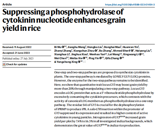 作者通過秈稻品種特青和粳稻品種02428構建高級遺傳群體克隆了產量相關基因GY3,其啟動子區(qū)域的反轉座子插入增強了啟動子區(qū)域的表觀修飾,降低GY3表達量,從而減少細胞分裂素合成前體底物的無效消耗,提高體內活性的細胞分裂素含量,增加每穗粒數(shù)和谷物產量。GY3可作為后期秈稻高產育種的重要目標基因,推動產量提升。