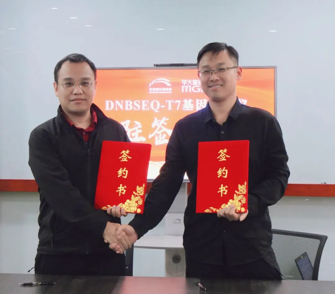 華大智造中國營銷中心全國大客戶總監(jiān)趙明(左)與百邁客生產(chǎn)研發(fā)副總裁張雪川(右)