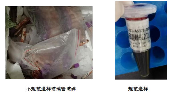 ②采集完血液之后需將血液轉移至 EP 管中,玻璃材質采血管冷凍之后易碎不規(guī)范送樣玻璃管破碎 規(guī)范送樣