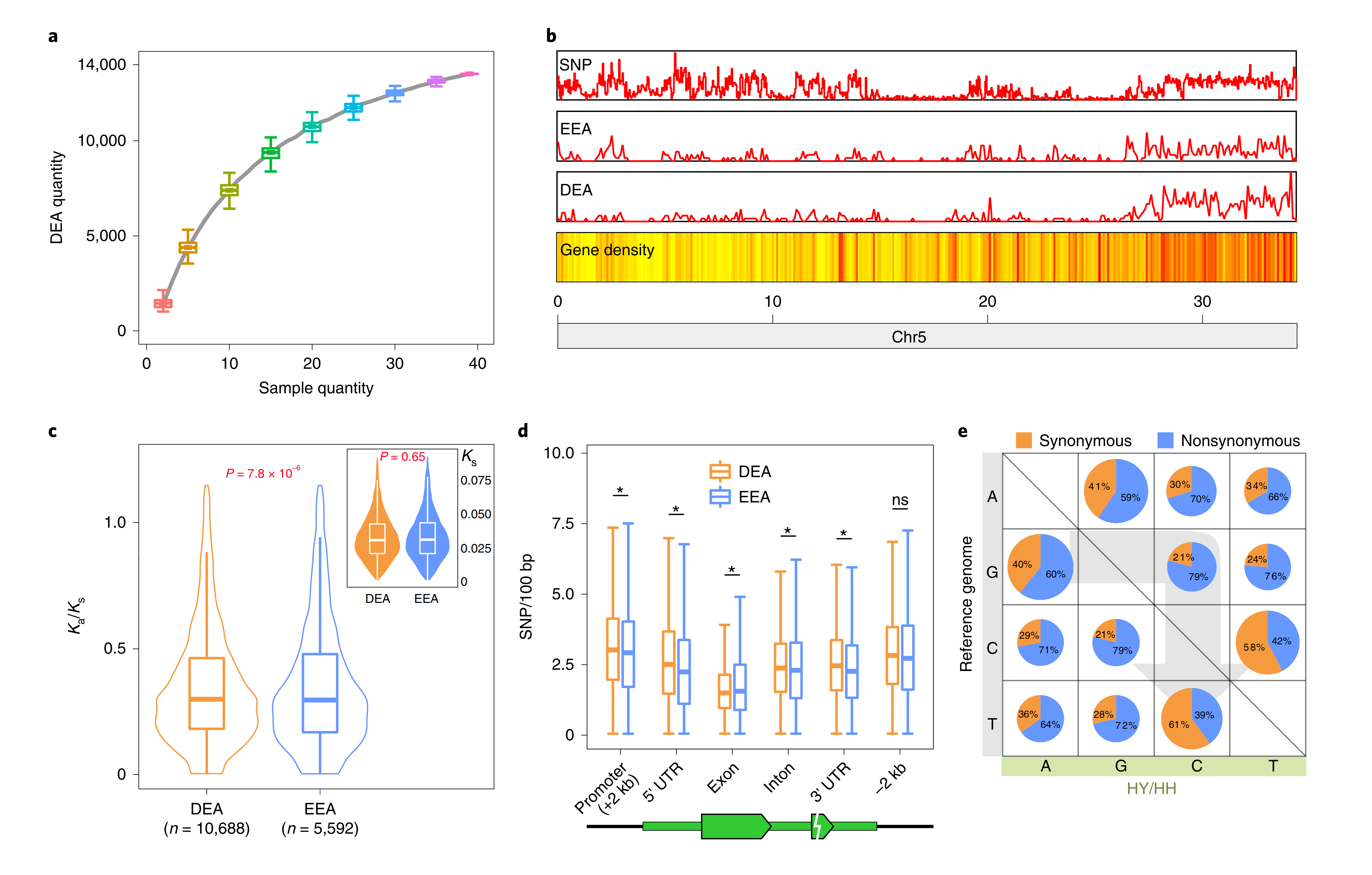 作者通過SNP分型和單細(xì)胞10x?Gemomics測序,利用“妃子笑”荔枝的高雜合性(2.27%),成功獲得的兩個單倍型的基因組(云南單倍型,HY;海南單倍型,HH)。對39個妃子笑”不同組織和時(shí)期樣本進(jìn)行轉(zhuǎn)錄組測序分析,共鑒定到13517個等位差異表達(dá)基因(DEA)。DEA在基因組上的分布并不是均勻的,在某些區(qū)域具有集中現(xiàn)象,可能與特定的生物學(xué)過程相關(guān)。還發(fā)現(xiàn),DEA和等位等量表達(dá)基因(EEA)具有相同的Ks值,但是DEA經(jīng)受更強(qiáng)的選擇壓力。
