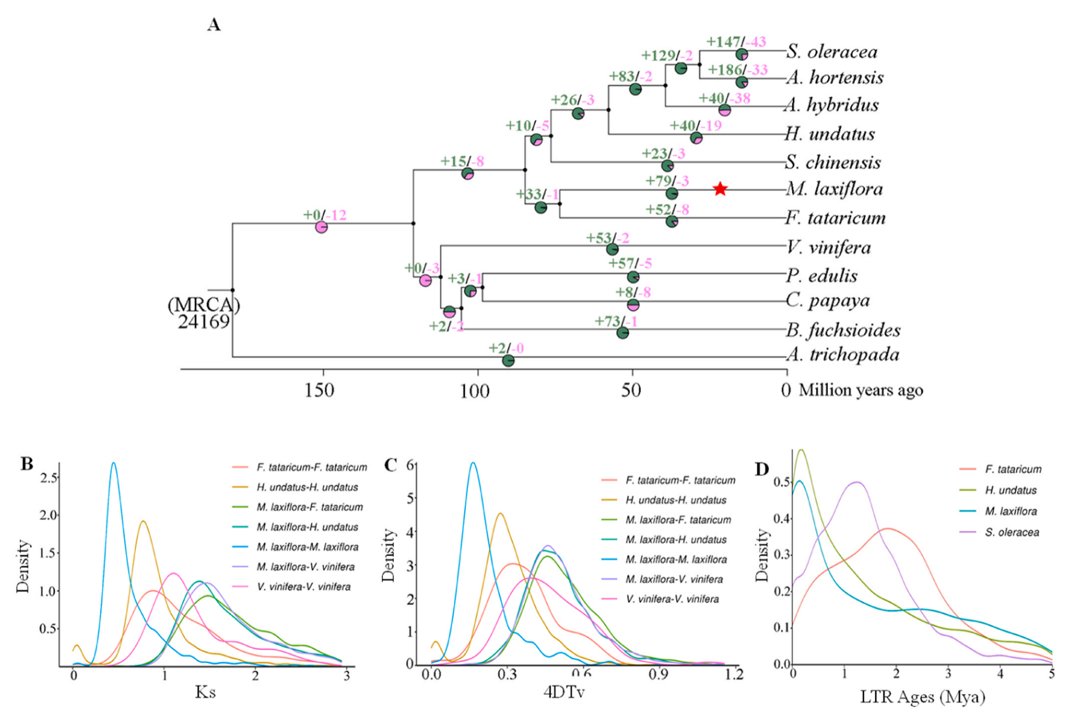 比較基因組研究發(fā)現(xiàn)疏花水柏枝與苦蕎(F. tataricum)的親緣關(guān)系最為密切,大約在65-81百萬年前(Mya)發(fā)生分化;在19.74 ~ 24.60 Mya之間發(fā)生了一次全基因組復(fù)制(WGD), 4dTV分析證實(shí)了這一點(diǎn)。在0.15 Mya左右存在一個長末端重復(fù)(LTR)插入。這些基因組變化可能與疏花水柏枝在進(jìn)化過程中所經(jīng)歷的環(huán)境劇變(如青藏高原隆升)有關(guān)?;蚣易宸治鲲@示疏花水柏枝的特有基因家族與能量代謝和信號轉(zhuǎn)導(dǎo)密切相關(guān);85個基因在疏花水柏枝基因組中經(jīng)歷了正選擇,這些基因在與氨基酸合成和代謝相關(guān)的KEGG通路中顯著富集。