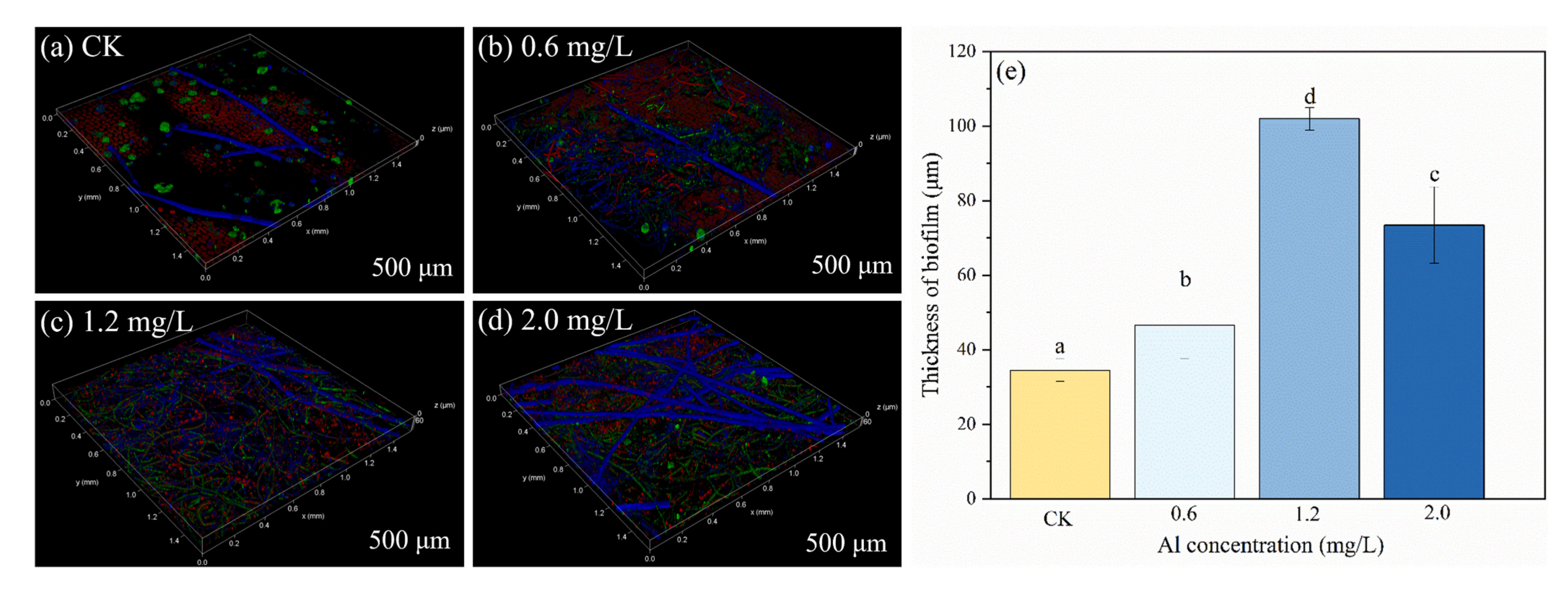 隨著Al濃度的升高,葉片上的生物膜聚集情況逐漸增加。利用多重?zé)晒馊旧虲LSM,我們觀察了Al處理下生物膜組分的不同性質(zhì),注意到核酸濃度在1.2 mg/L組達(dá)到峰值(圖1c)。藻類密度和附著生物膜厚度隨Al濃度的增加而增加,1.2 mg/L組最大厚度為101.94μm,CK組為34.50μm(圖1e)。結(jié)果表明,鋁處理促進(jìn)了苦草附著生物膜的生長(zhǎng)。所觀察到的現(xiàn)象可能歸因于Al離子分散到水生環(huán)境中,隨后與水體中的氮和磷形成聚集體。這些聚集體通過(guò)沉降作用積聚在沉水植物葉片表面,增加附著生物膜內(nèi)的氮和磷含量,促進(jìn)附著微生物的生長(zhǎng)。