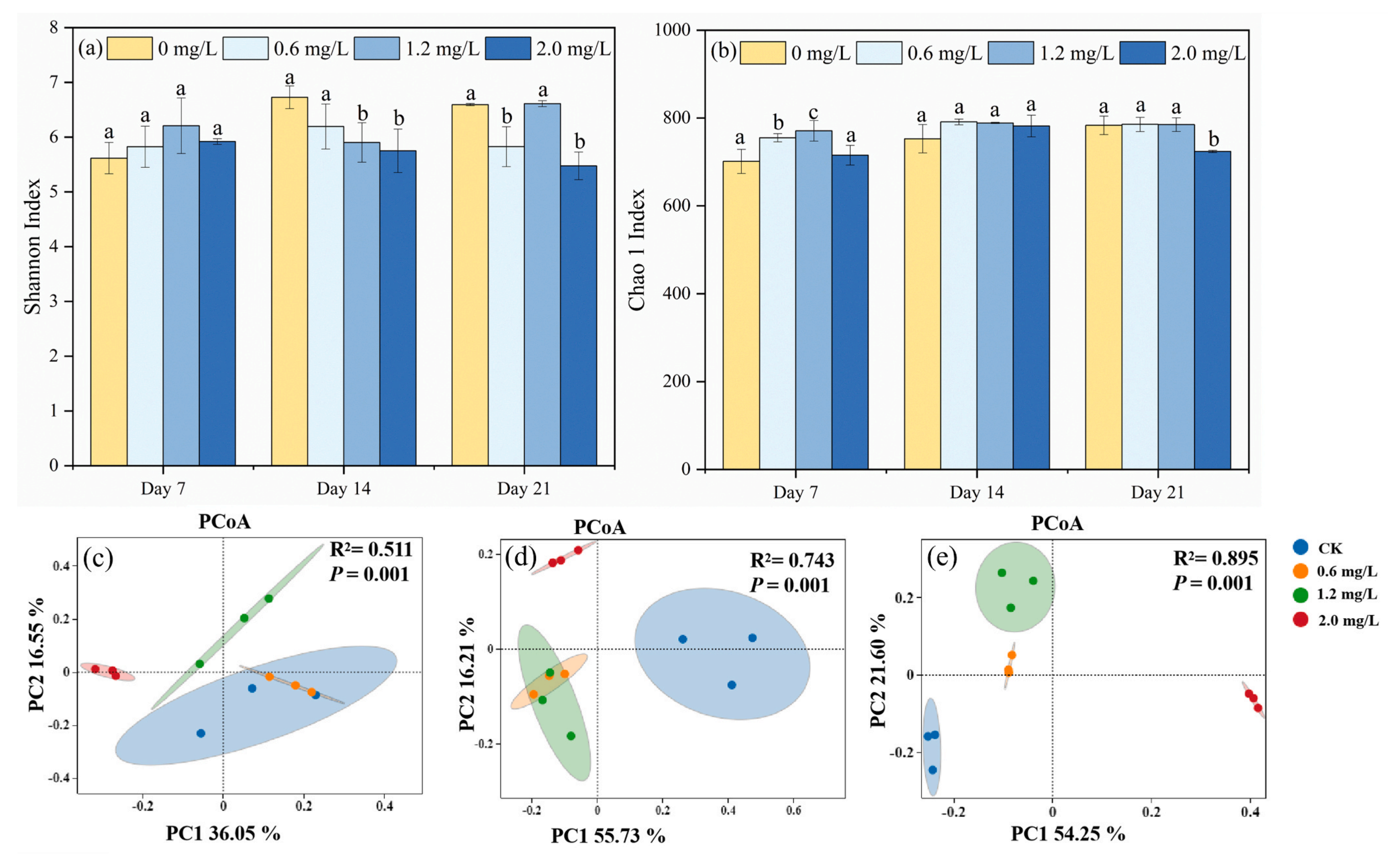 第14天,CK和0.6 mg/L組的Shannon多樣性均高于1.2和2.0 mg/L組(圖2a),處理間Chao1指數(shù)無(wú)顯著變化(圖2b, P>0.05);