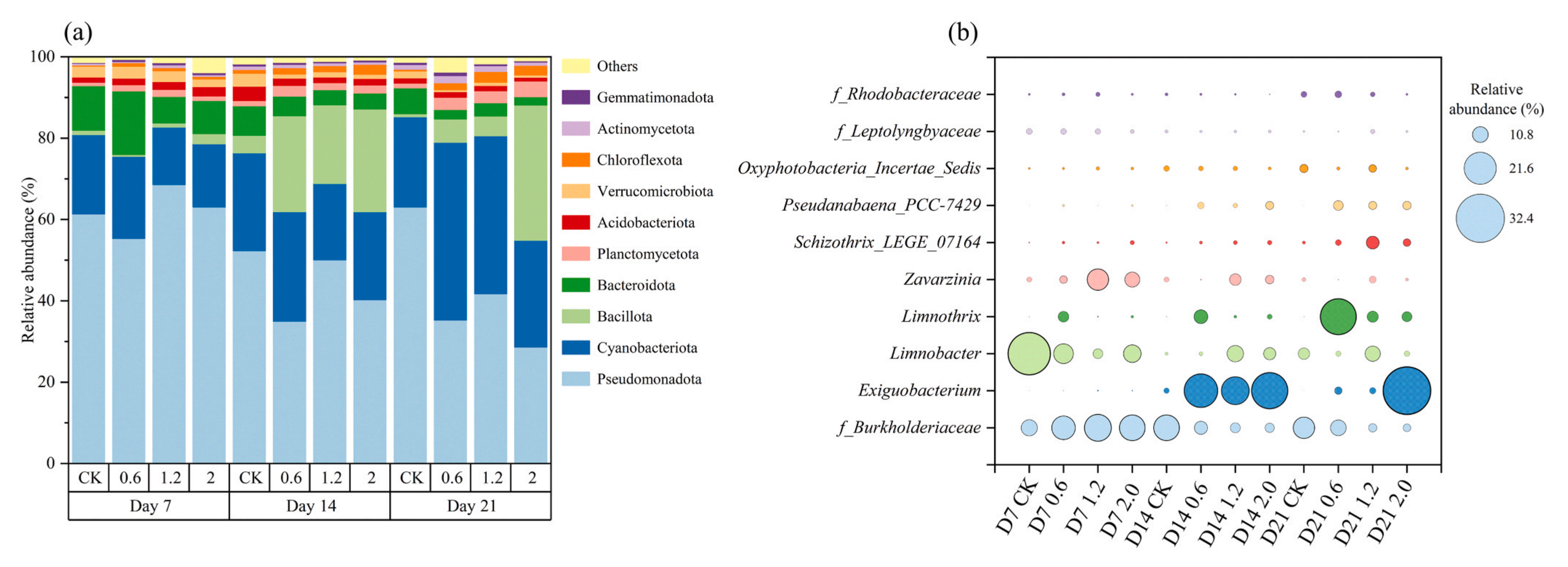 門水平的細(xì)菌群落組成結(jié)果顯示了微生物群落對(duì)Al暴露的動(dòng)態(tài)響應(yīng)(圖3a)。變形菌門(28.64% ~ 68.58%)、藍(lán)細(xì)菌門(14.15% ~ 43.74%)、厚壁菌門(0.48% ~ 33.24%)和擬桿菌門(2.10% ~ 15.60%)是所有附著生物膜樣品中的優(yōu)勢(shì)菌群,廣泛存在于苦草葉片的附著生物膜。同時(shí),變形菌門和擬桿菌門在各處理組中均占優(yōu)勢(shì)地位。然而,在濃度分別為1.2 mg/L和2.0 mg/L的Al處理21天后,兩個(gè)門的相對(duì)豐度均顯著低于CK組,說(shuō)明這些細(xì)菌的增殖受到了Al暴露的影響。