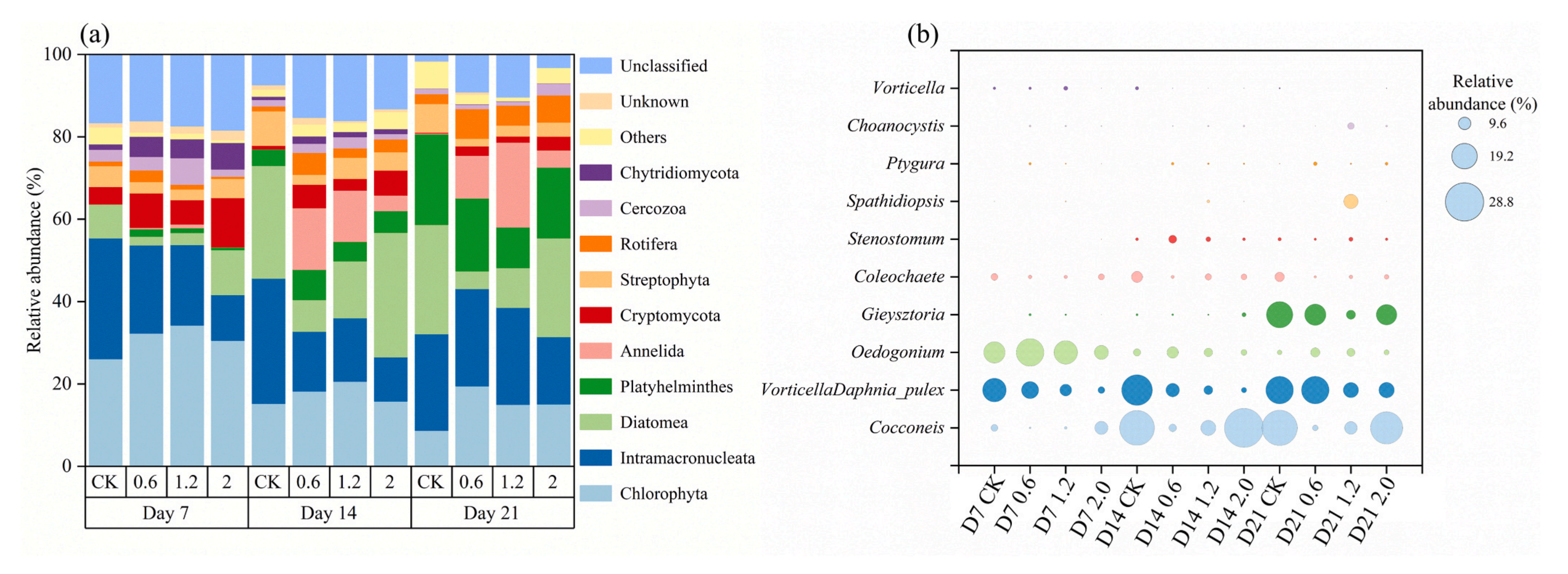 根據(jù)注釋結(jié)果,在所有樣本中鑒定出10個(gè)優(yōu)勢(shì)的微型真核生物門,分別是Chlorophyta(8.71–34.25%),Intramacronucleata (10.69–30.43%),Diatomea (2.11–30.24%), Platyhelminthes (0.02–22.00%),Annelida (0.04–20.60%), Cryptomycota (0.21–11.99%), Streptophyta (1.84–8.37%),Rotifera (0.52–7.23%),Cercozoa (0.91–6.45%),Chytridiomycota (0.07–6.42%) (圖5a)。值得注意的是,在處理組中Rotifers的豐度顯著增加(圖5a)。在實(shí)驗(yàn)后期,尤其是處理組,PlatyhelminthesAnnelida的相對(duì)豐度有所增加(圖5a)。