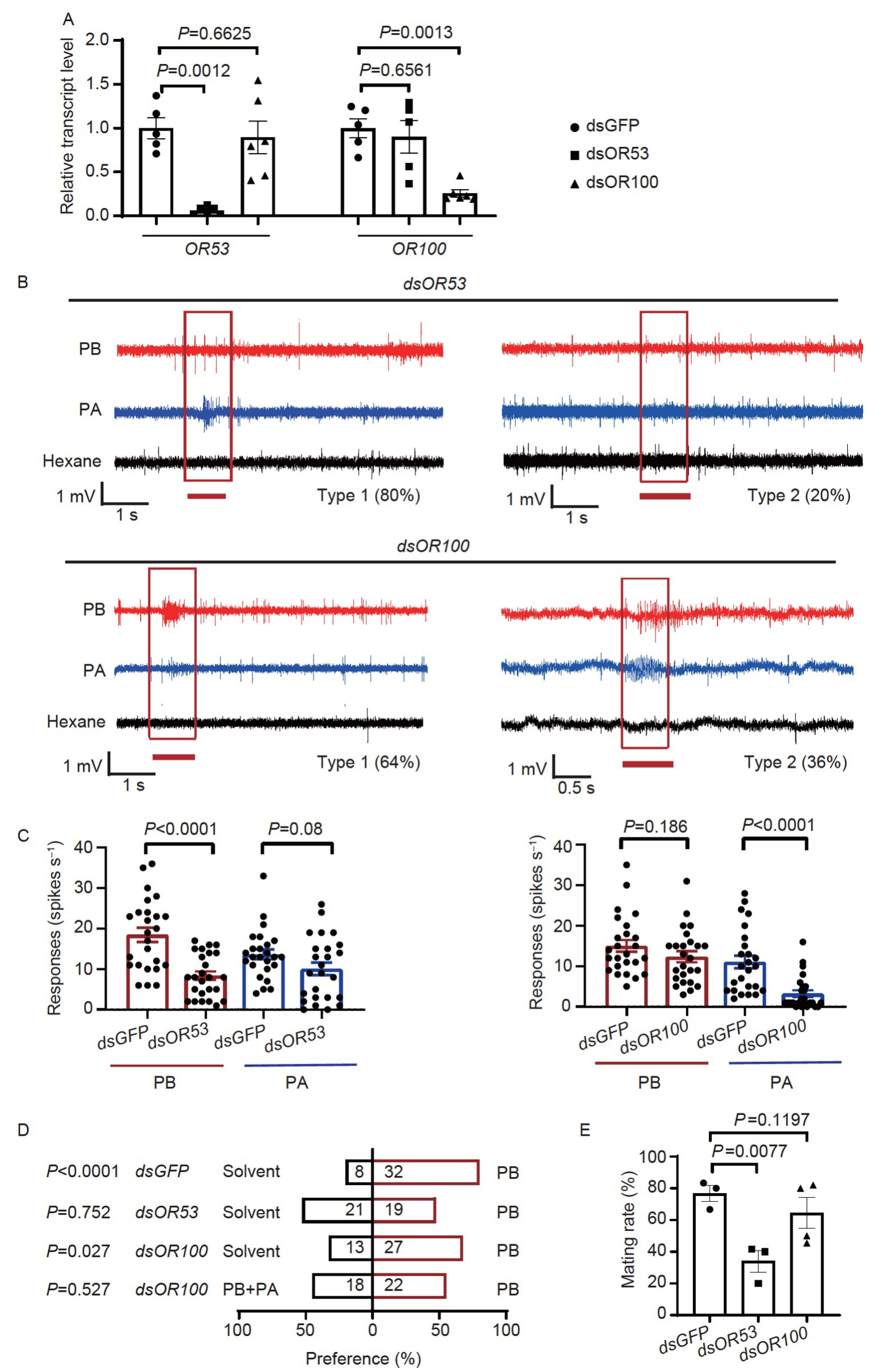 通過單感器記錄(SSR)技術(shù),研究人員探索了雄蟲對兩種性信息素成分PA和PB的響應(yīng)(圖1E-F)。研究人員,發(fā)現(xiàn)了兩種類型的感受器對PA和PB的響應(yīng)模式:類型1:對PA和PB兩者都有明顯的響應(yīng),即產(chǎn)生了強烈的電生理動作電位。類型2:僅對PB有強烈的響應(yīng),而對PA的響應(yīng)較弱或沒有明顯響應(yīng)。結(jié)果表明,PA和PB可能作用于至少兩種不同的嗅覺受體神經(jīng)元(ORNs)或者在至少兩種類型的感器中共享嗅覺受體,以調(diào)節(jié)雄蟲的求偶交配行為。