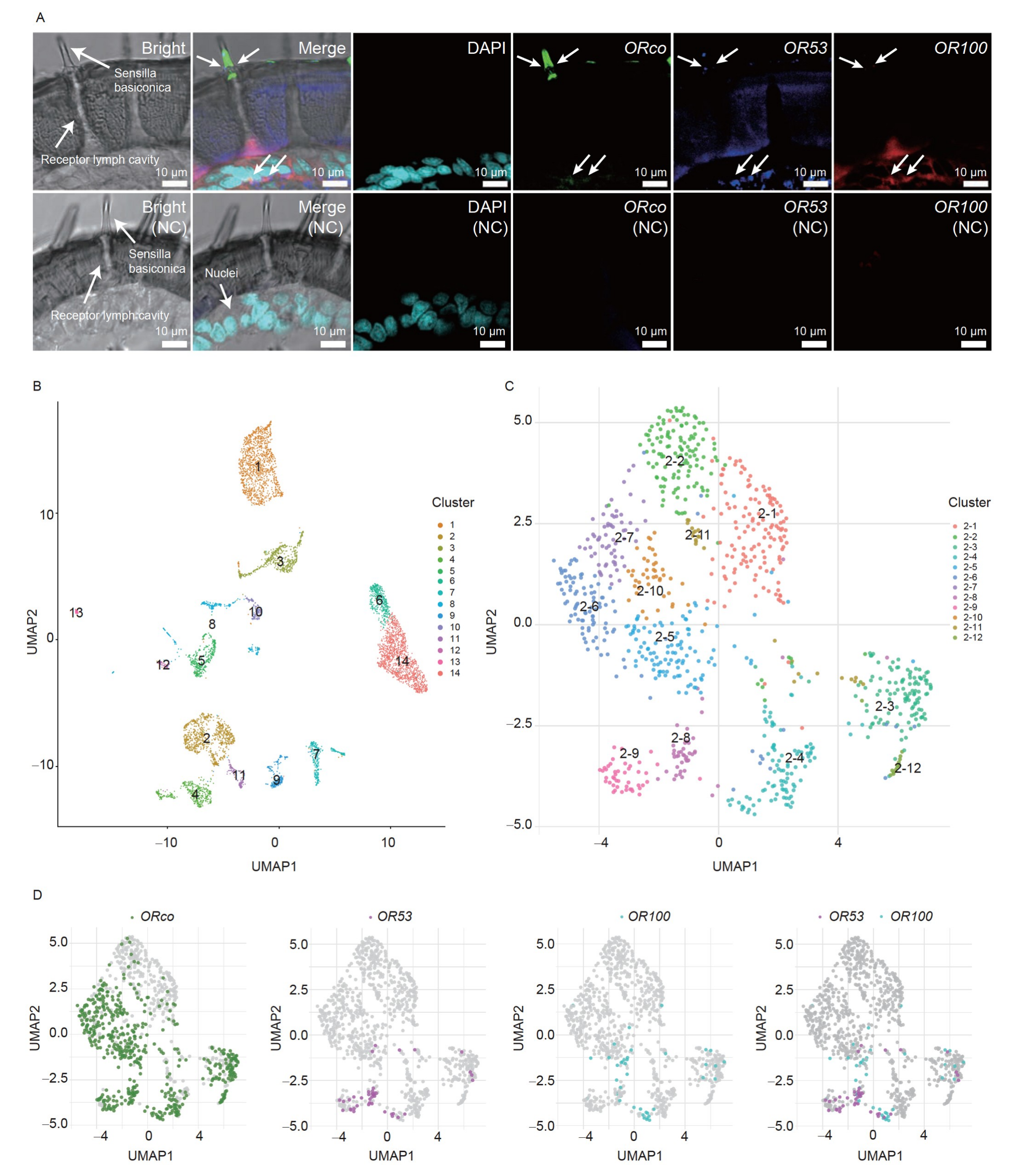研究人員利用FISH技術(shù),觀察到OR53、OR100ORco經(jīng)常在同一個感受器中表達,說明大多數(shù)基本感受器同時含有OR53OR100的ORN。為了更系統(tǒng)地研究OR基因的表達,研究人員使用性成熟雄蟲的觸角進行了單細(xì)胞測序。測定每簇細(xì)胞的基因表達水平,鑒定出Cluster 2為ORco高表達的ORN(圖4B)。進一步分析Cluster 2細(xì)胞得到12個亞型(圖4C)。其中大部分感受器同時具有OR53OR100兩種OR53 ORNs,而少數(shù)感受器僅具有OR53?ORNs。12個亞型中有4個同時表達OR53OR100,可能對應(yīng)于主要的1-型感受器的ORNs。在2-亞型中,還發(fā)現(xiàn)了OR53的顯著表達亞型,可能對應(yīng)2型感受器的ORNs,也可能只有少量的感受器OR100?ORNs(圖4D)。這些結(jié)果進一步支持了性成熟雄蟲觸角中至少存在兩種錐形感受器。