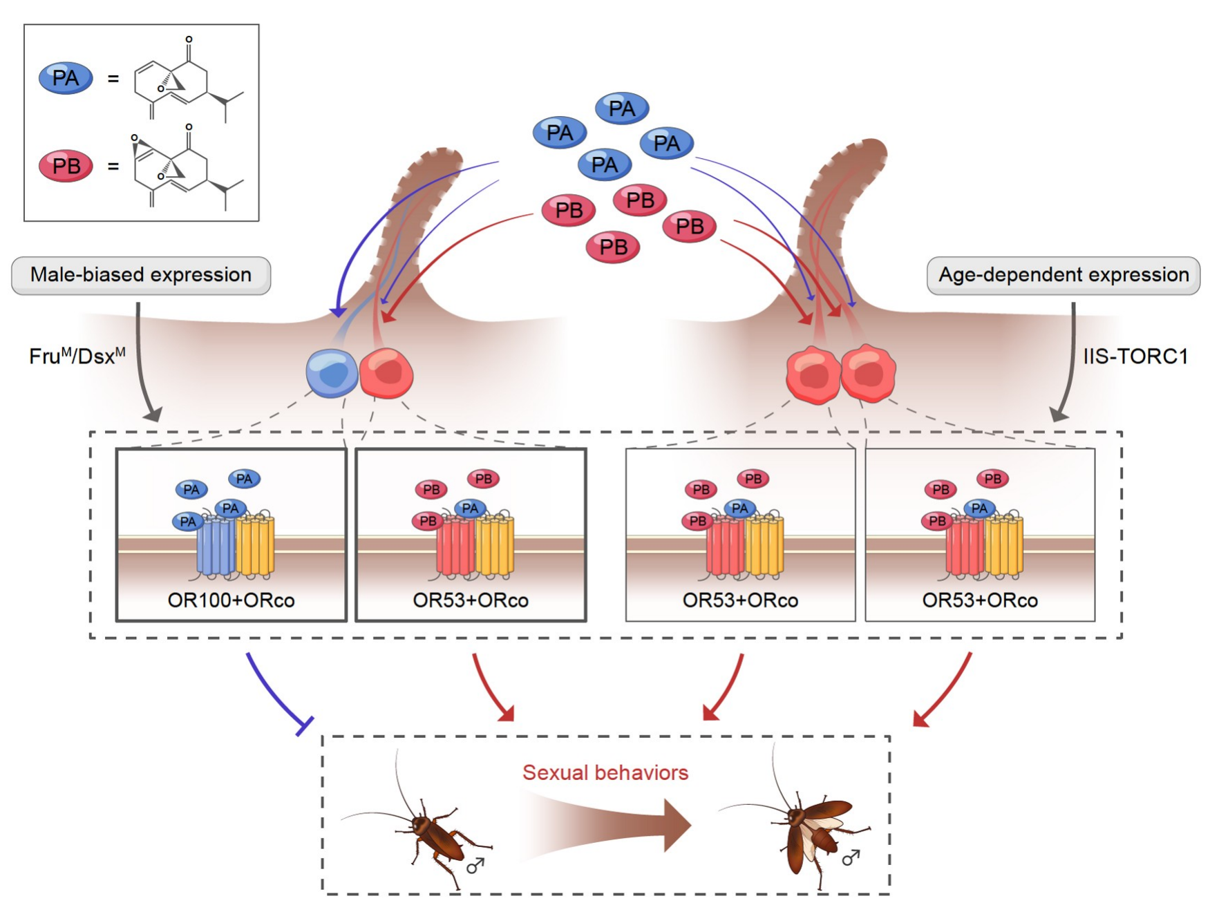 研究結(jié)果表明,PB作為主要的性信息素成分,通過激活OR53受體來誘導(dǎo)雄蟲的求偶交配行為。而PA雖然單獨存在時不吸引雄蟲,但其存在能夠通過兩種可能的途徑減弱PB的吸引作用:一是PA與PB競爭激活相同的受體OR53,二是PA通過激活其特定的受體OR100來抑制性行為。該研究確定了兩種性信息素嗅覺受體以及可能調(diào)控雄蟲特異性和年齡依賴性求偶交配行為的分子機制,有助于發(fā)展綠色防蟑技術(shù)及害蟲綜合管理策略。
