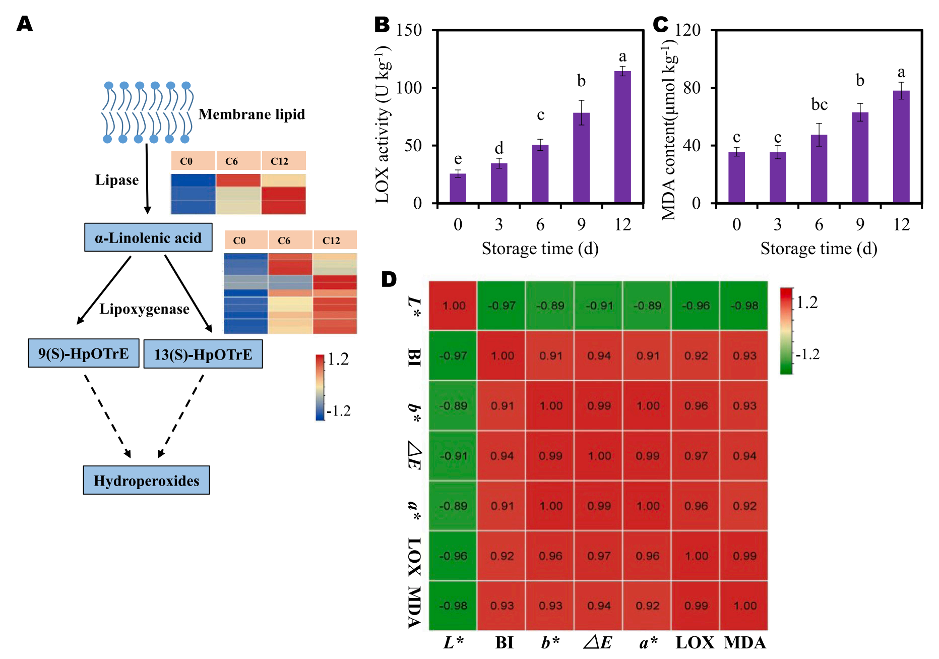 丙二醛通常被認(rèn)為是植物脂質(zhì)過(guò)氧化的生物標(biāo)志物。為了監(jiān)測(cè)切片芋頭褐變過(guò)程中膜脂過(guò)氧化情況,測(cè)定了LOX活性和MDA含量。隨著時(shí)間的推移,LOX活性和MDA含量隨著褐變繼續(xù)進(jìn)行逐漸升高 (圖7B, C)。這些結(jié)果表明,在褐變過(guò)程中,膜脂過(guò)氧化加劇。此外,相關(guān)分析顯示,LOX活性、MDA含量和其他褐變指標(biāo)之間存在很強(qiáng)的相關(guān)性?(圖7D)。這些結(jié)果進(jìn)一步支持了膜脂過(guò)氧化和/或代謝參與芋頭褐變。
