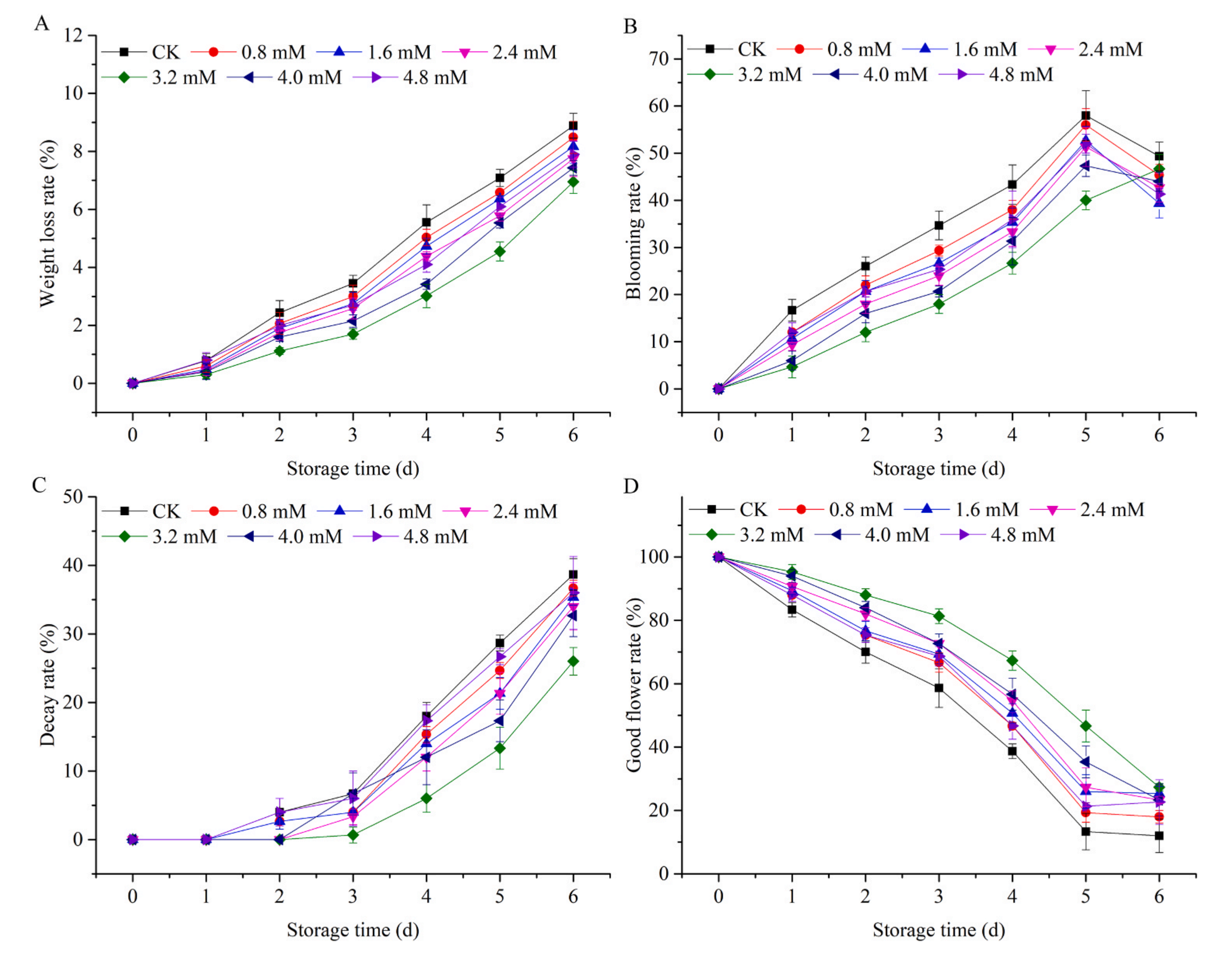 本研究選用黃花菜(萱草)“大同黃花”,產于中國山西省大同市云州區(qū)?;ɡ偈窃谏虡I(yè)成熟前采摘的。將剛采收的黃花菜花蕾在4℃預冷后,在4 h內立即運至實驗室。花蕾顏色、形狀、大小均勻,無物理損傷,分為7組。將每組黃花菜芽(200 g)分別置于含有200 mL蒸餾水、0.8、1.6、2.4、3.2、4.0、4.8 mM NaHS溶液(H2S供體)的干燥器中。干燥劑保存于4℃,相對濕度85% ~ 95%。測定了黃花菜的失重率、開花率、腐爛率和良花率,初步評價了黃花菜的品質。